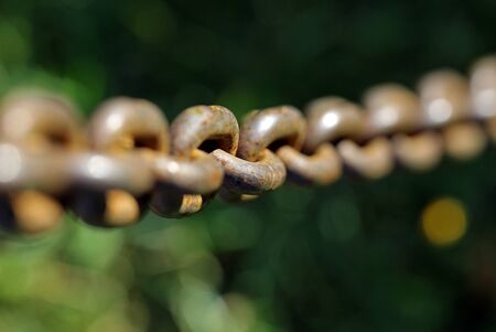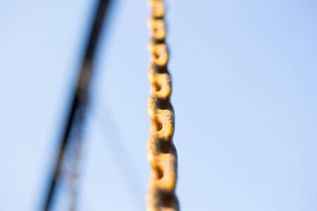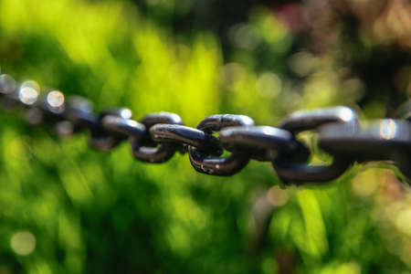 Metal chain hanging in the air outdoor. Selective focus with blurred grass background.
