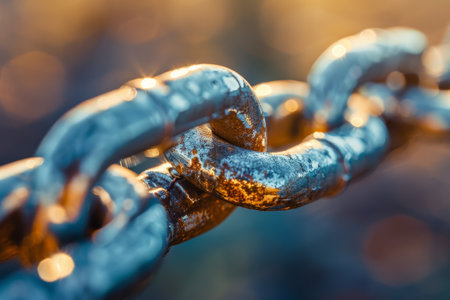 A close-up view showcases a weathered metal chain link with rust, illuminated by sunlight, emphasizing its durability amidst a gently blurred background.