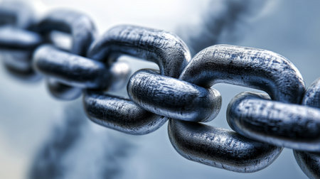 A striking close-up reveals a weathered black chain, emphasizing its inherent strength and the concept of connection. The steel links, detailed with a shallow depth of field, showcase a rough and corrosion-touched texture, highlighting the industrial nature of the object. This macro image, rich in detail and with hints of shiny reflectivity, symbolizes security, protection, and solidarity. Ideal for visual concepts related to teamwork, freedom, and industrial design, this image offers a powerful visual statement.
