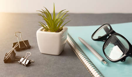 Artificial grass in a pot with glasses and notepad on a wooden table on a white background.