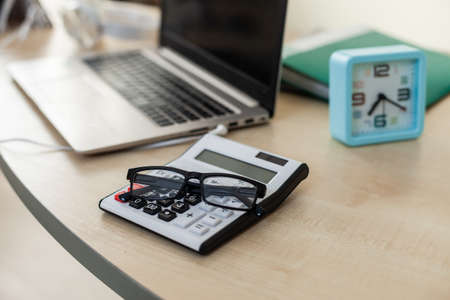 Calculator with glasses close up on table with workspace