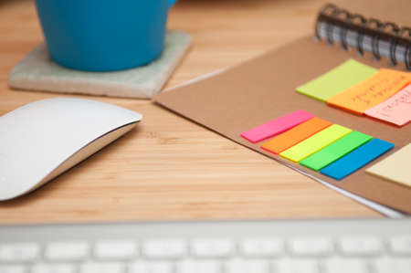 Close up view of home office desk with copy space, coffee mug, diary notebooks, stationery and decorations