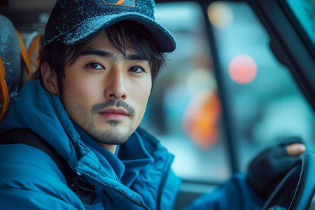 Close up portrait of a truck driver looking to his left