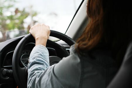 woman driving car, hand hold steering wheel