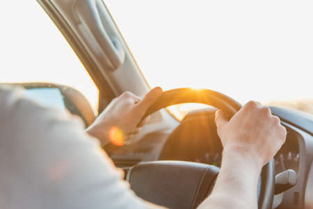 Close up man hand driving a car at sunset. The concept of car travel