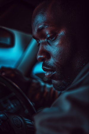 Pensive Man at Car Steering Wheel in Thoughtful Moody Lighting.