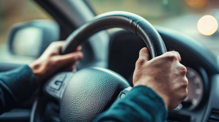 Focused Human Hands Firmly Gripping the Steering Wheel, Ensuring Safe Travel During the Journey