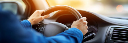 Learning to Drive Close-Up of Male Hands on Steering Wheel in Modern Car Interior During Sunset