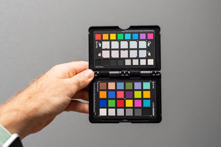 PARIS, FRANCE - OCT 29, 2018: Professional Color Passport by X-Rite Color Reference Targets and camera calibration sfotware before the professional photo session shooting studio shot on gray background