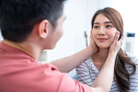 Asian young loving couple sit on sofa and look at each other with love. Attractive romantic new marriage man and woman enjoy spend time together on anniversary valentines day in living room at home.