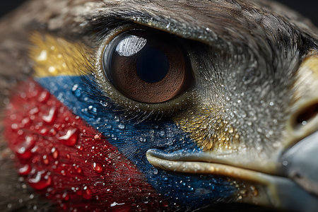 Close-up of a bird showcasing its vibrant plumage with red, blue, and yellow feathers. the detailed shot highlights water droplets on the feathers and the bird's expressive eye, creating a striking nature and wildlife concept. Generative AI