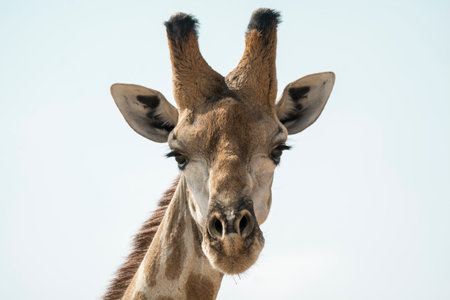 Portrait of a curious giraffe over blue sky