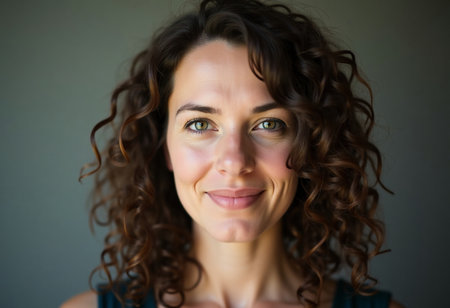 A woman with curly hair and striking green eyes offers a warm smile, creating a welcoming atmosphere. The soft background emphasizes her natural beauty and charisma.