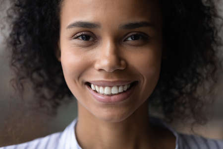 Head shot close up of beautiful African American woman face, curly brunette attractive young female with healthy toothy smile and perfect smooth skin looking at camera, oral hygiene or skincare
