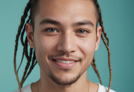 A close-up portrait of a young man with curly hair and a warm smile, set against a calming blue backdrop. His expressive eyes and friendly demeanor radiate positivity and approachability, inviting connection and warmth.