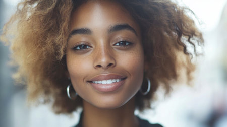 A close-up portrait of a smiling woman with beautiful curly hair, radiating confidence and warmth in an urban setting. Her joyful expression captures natural beauty and charm.