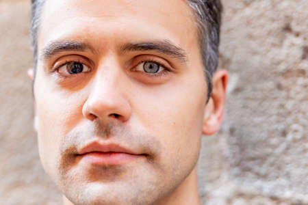 Face of serious bearded caucasian armenian young man looking at camera. Attractive guy stand on street city lifestyle. People. Beauty. Stand outdoors