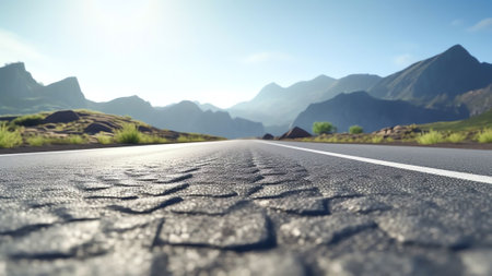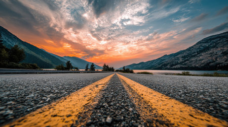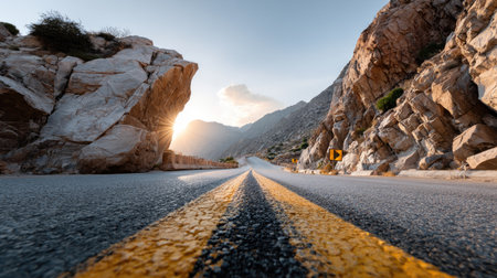 Captivating view of a long highway leading towards stunning mountains, with warm sunlight illuminating the scene, inviting adventure and exploration amid nature's tranquility.