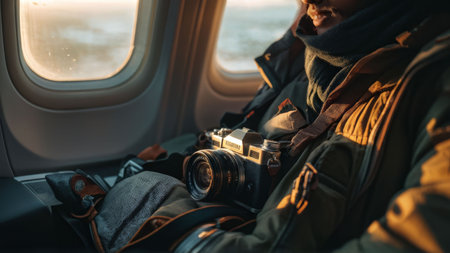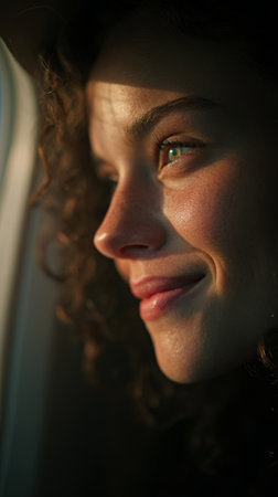 Woman gazing out of airplane window, enjoying the morning light and the feeling of travel
