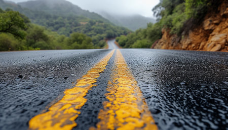 Wet asphalt road with yellow lines leading into the mist.