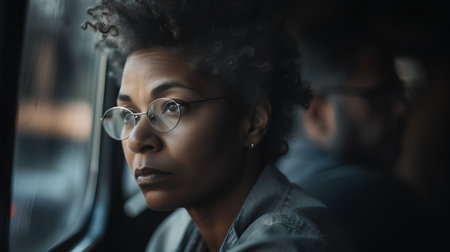 Young african american woman in eyeglasses looking away in train