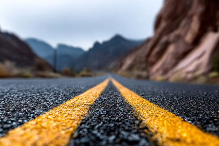 Yellow Lines Guiding Through Dark Asphalt Towards Majestic Desert Mountains Under Cloudy Sky