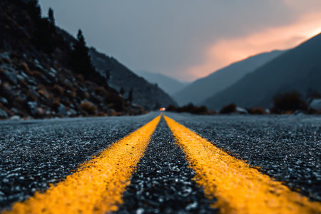 Twilight Roadway Adventure, Asphalt Landscape with Distant Hills, Embracing Nature s Serenity