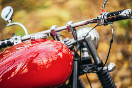 Red custom old fashioned motorcycle on the road in the forest with colorful blurred background
