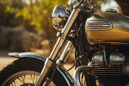 Motorbike with shining parts, close up. Motorcycle engine, toned