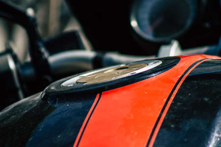 Illzach - France -9 June 2019 - retail of orange and blue painting on Harley Davidson motorbike parked in the street