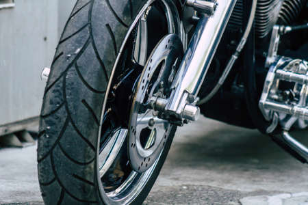Closeup aluminum alloy wheel of motorcycle parked at car parking lot. Steel rims. Mag wheels of motorbike. Performance wheel and tire of motorcycle. Chrome disc brake and abs. motorbike accessory.