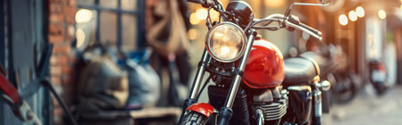 Close-up of a classic red motorcycle parked outside a building, capturing a vintage vibe and adventure spirit, perfect for automotive and lifestyle themes.