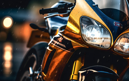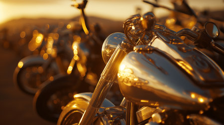 Motorcycles gleam in the sunset, showcasing their craftsmanship and style