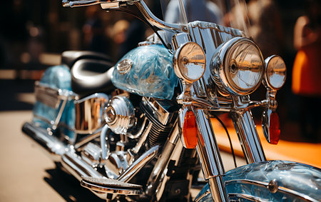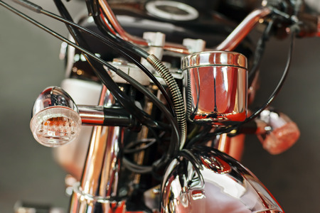 Chromed motorcycle handlebars and headlights, close-up Stylish custom chopper motobike with chrome details. Soft selective focus.