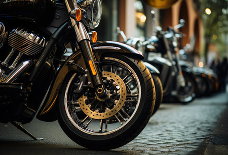 Motorcycle urban culture: close-up of a motorcycle wheel on a city street