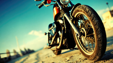 A classic motorcycle is captured from a low angle, showcasing its details. The vehicle is set against a bright, expansive sky, and rests on a sandy surface. The composition uses a shallow depth of field, with the front wheel in sharp focus. This image could be used for transportation, adventure, or lifestyle themes.