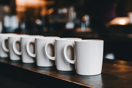Colorful coffee cups arranged neatly on a wooden table in a cozy cafe during the morning, creating an inviting atmosphere for coffee lovers and visitors