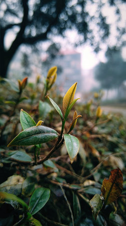 This close-up image features dew-covered leaves amidst a foggy atmosphere, creating a serene and tranquil setting ideal for nature-themed projects.