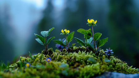 Three striking yellow flowers bloom on soft green moss, captured with a blurred misty forest backdrop, showcasing nature's serene beauty.