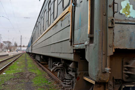 Old rusty railway cars stand on the tracks of the station