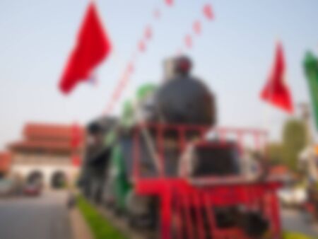 Natural bright blurred background of old train monument.