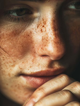 Woman with freckled skin and a thoughtful expression, resting hand on chin