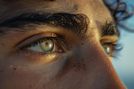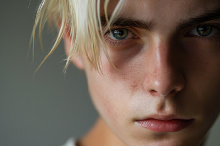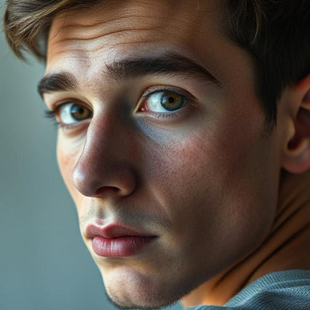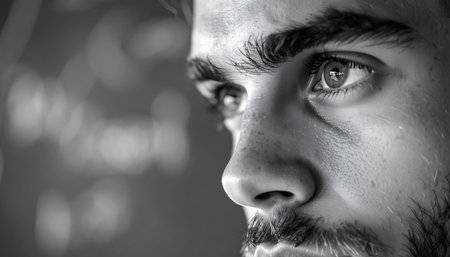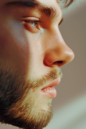 Close view of a young mans facial features showcasing smooth skin and focused expression