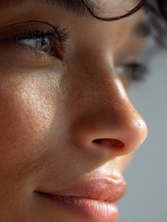 A person looks towards the side with visible skin details, soft light highlighting features, creating an authentic emotion and simple background.