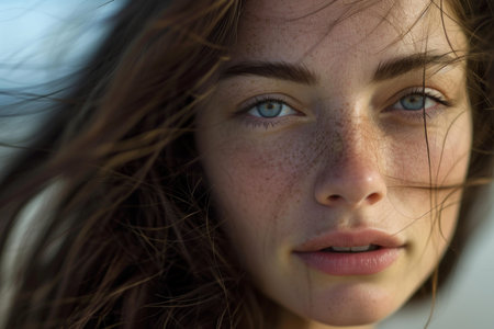 Close-up portrait of a beautiful young woman with freckles