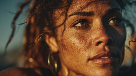 A close-up shot of a woman with striking features, bathed in warm sunlight, showcasing her glowing skin.