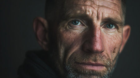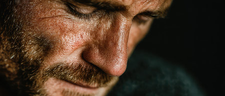 A man with a rugged face shows deep emotions while lost in thought illuminated softly in low light highlighting his intense gaze.