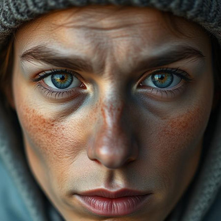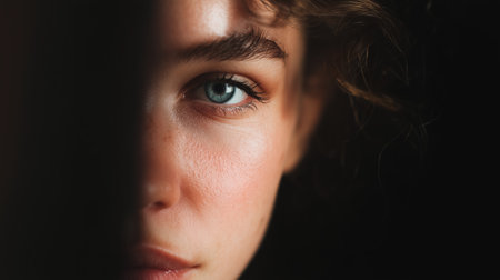Close up portrait of person with striking green eyes, illuminated by soft natural light. Shadows create dramatic effect face, highlighting skin texture and features. expression conveys sense