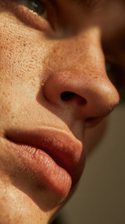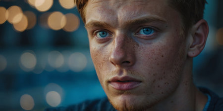 A photo portrait in candid realism portrays a guy with distinctive freckles on his face, highlighting his natural beauty and character in a sincere