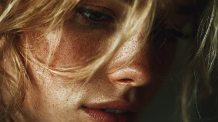Cinematic portrait of freckled model with blonde hair covering face